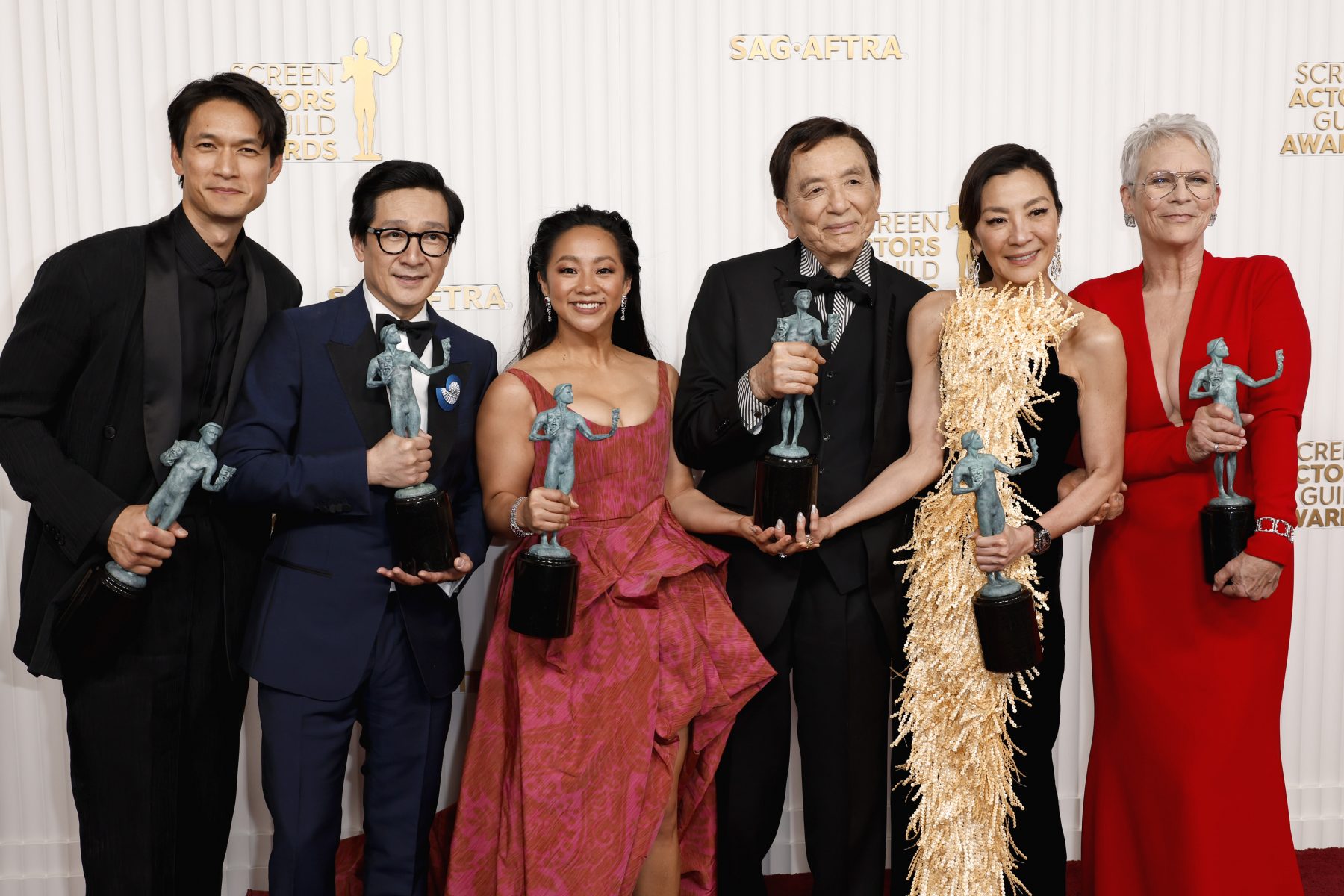 LOS ANGELES, CALIFORNIA - FEBRUARY 26: (L-R) Harry Shum Jr., Ke Huy Quan, Stephanie Hsu, James Hong, Michelle Yeoh, and Jamie Lee Curtis, recipients of the Outstanding Performance by a Cast in a Motion Picture award for "Everything Everywhere All at Once," pose in the press room during the 29th Annual Screen Actors Guild Awards at Fairmont Century Plaza on February 26, 2023 in Los Angeles, California. (Photo by Frazer Harrison/Getty Images)