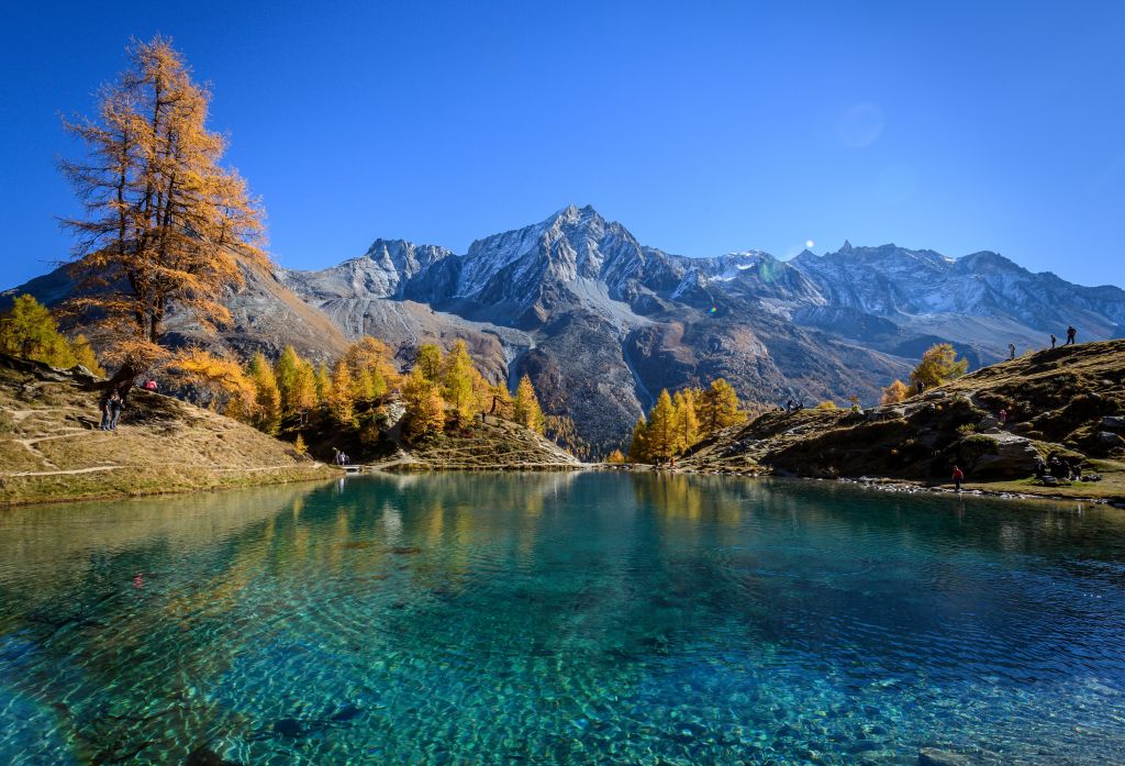 The "Blue Lake" surrounded by larch trees is seen on a warm autumn day on October 20, 2018 above Arolla, western Switzerland. (Photo by Fabrice COFFRINI / AFP) (Photo credit should read FABRICE COFFRINI/AFP/Getty Images)