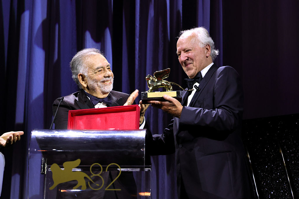 Werner Herzog 從 Francis Ford Coppola 手中接下終身成就金獅獎。(Getty Images)