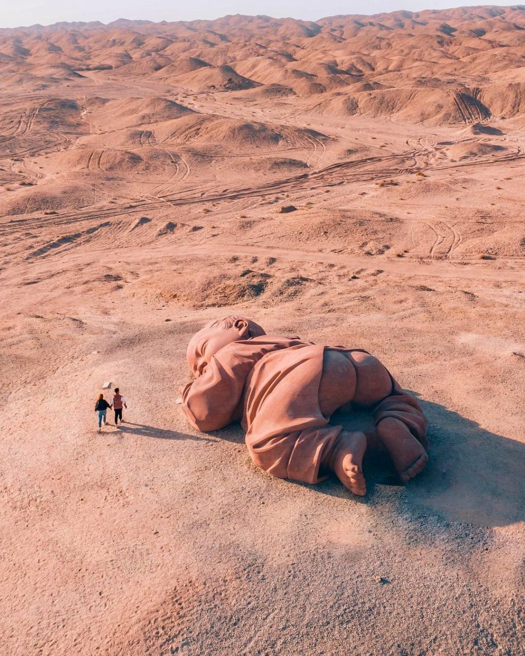 在中國瓜州紅山坡隔壁灘中有一個與自然融為一體,名為大地之子、長15米的巨型嬰兒雕塑,早茫茫戈壁中的形成藝術奇觀。雕塑由清華大學美術學院董書兵教授在2016年3D打印、雕刻再分塊組裝而成,也是他至今為止最大的嬰兒雕塑作品。恬然入睡嬰兒象徵人物融入自然母親的懷抱,具有震撼的視覺效果和生命力也成為了旅遊必訪之處。