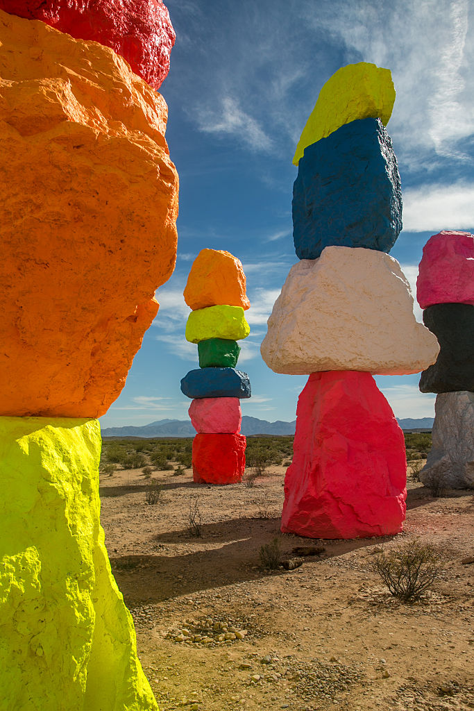 從拉斯維加斯前往洛杉磯,穿過內華達州的沙漠,你一定會看到瑞士藝術家Ugo Rondinone在那里安裝的七座約10公尺高的螢光色石塔,重量超過800公噸,是美國近四十年來規模最大的環境藝術(Land Art)作品之一。七座魔法石是由1997年開始的關於自然與色彩的研究的最後階段,在2016年落成,為沙漠帶去了奇幻色彩,無論在白天還是夜晚與自然氛圍相互對立,許多明星都有前去參觀。