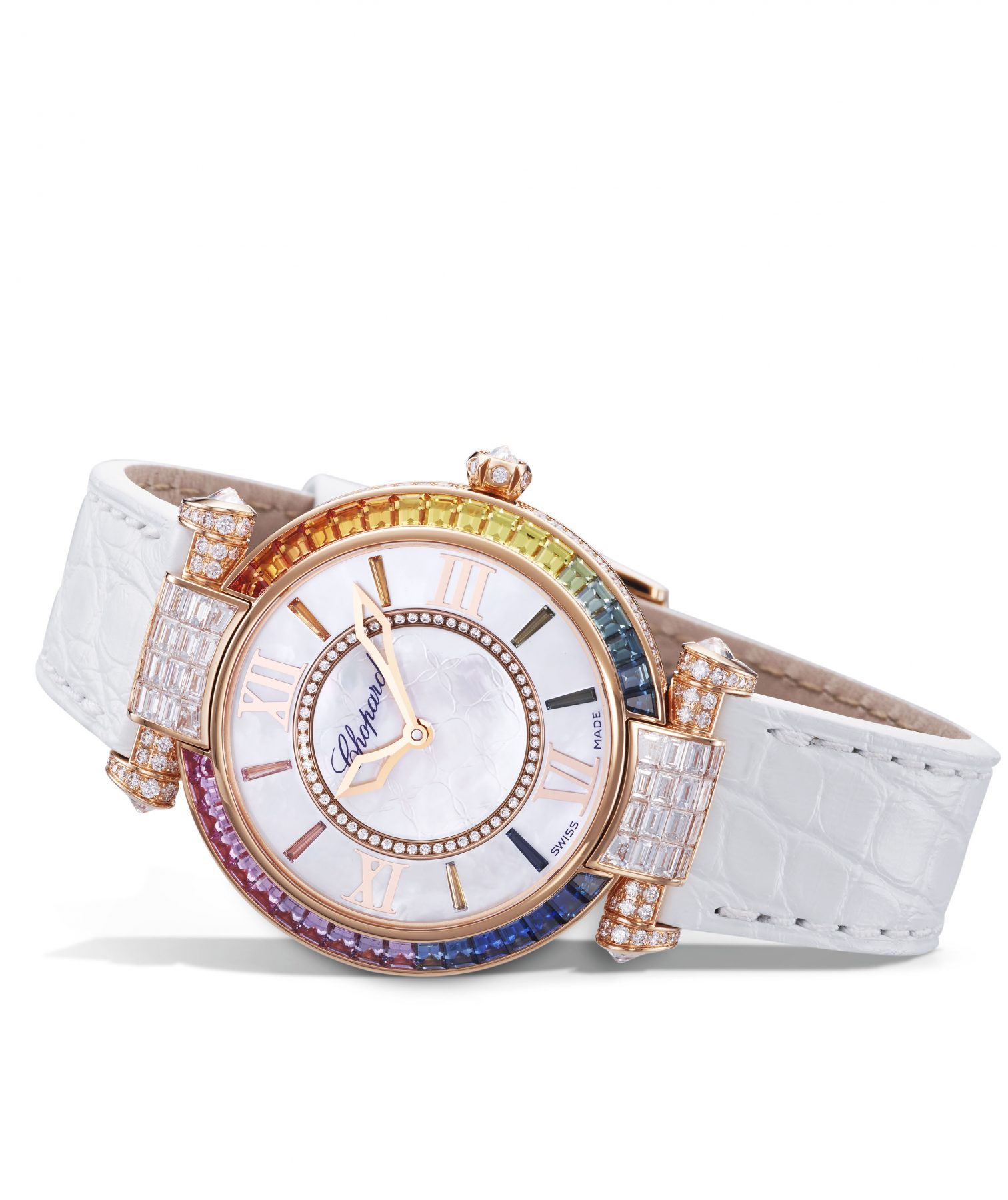 色彩繽紛的介紹又怎可以少了 Haute Joaillerie (高級珠寶) 呢?Chopard Imperiale Joaillerie Rainbow 腕錶,18k玫瑰金錶殼完全鋪滿鑽石,錶圈鑲嵌了各種漸變色調長方形切割藍寶石,橙、黃、綠、藍、靛青和紫;呈現瑰麗的彩虹色彩。錶盤的設計與錶殼互相輝映,時標也是漸變的寶石;錶盤的材質用上大溪地的珍珠母貝。追求型格的人都偏向喜歡較大的錶,36mm的尺寸剛剛好,配合白色鱷魚皮帶,elegant 之餘又帶點 chic。