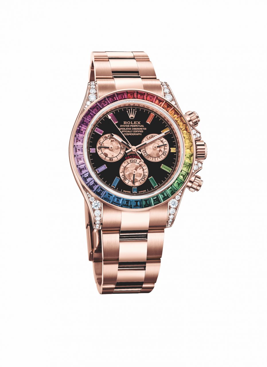 談到以彩虹為主題的腕錶,不能不提 Rolex 的 Daytona 了;因為整個彩虹系列的潮流,就是因它而起。作品兩年前面世,但至今仍然供不應求。Daytona Rainbow(ref:116595)一推出後,幾乎馬上成為“cult piece”,是現代腕錶的奇蹟。2018年的款式是首次用上永恆玫瑰金殼;錶圈鑲有36顆長方形切工的藍寶石,呈現彩虹漸變色,中層鑲有56顆圓形鑽石,配上黑漆的錶盤,小錶盤則用上18k玫瑰金,指針也同樣為玫瑰金,是真正動靜皆宜的腕錶。其實 Rolex 早在70年代已經生產彩虹主題的腕錶,一般會以錶圈來營造彩虹的漸變色彩,Daytona Rainbow 只是引發近年彩虹潮流的起源。Daytona Rainbow 之後,Rolex 繼續推出其他的彩虹系列;最新的 Day Date 36 White Gold Rainbow(ref:128349RBR)腕錶則採用了較簡潔的設計,12個彩虹色的寶石作為小時標記;而錶圈、錶盤和手鐲均鋪滿圓形鑽石。請不要以為 Rolex 的機芯就沒甚麼特別,這錶是採用了最新的3255自動機芯,內涵有着多重的專利,是 Rolex 現時最先進的機械機芯,耐用、精準、可靠融為一體。