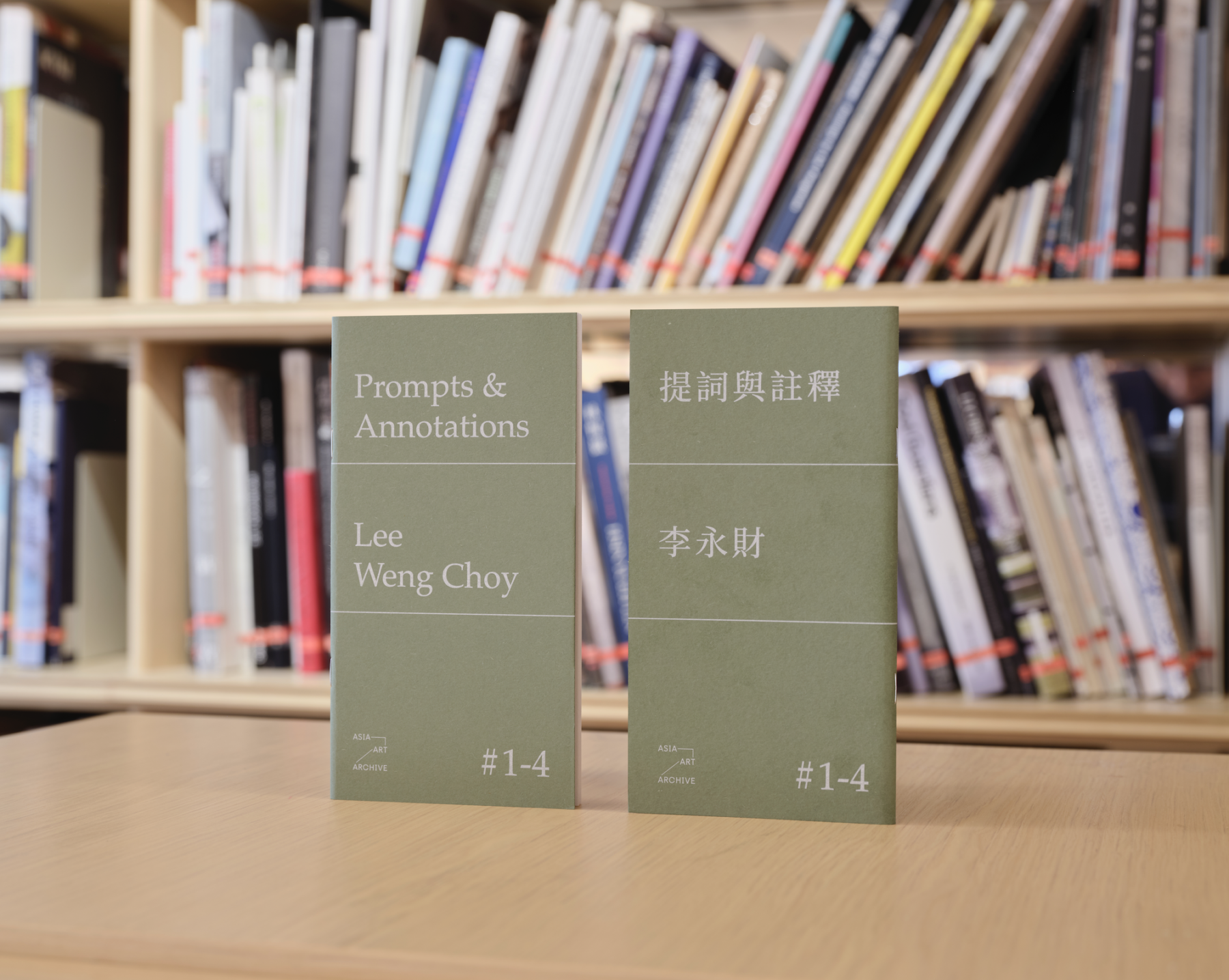 Publication of Lee Weng Choy’s Prompts & Annotations, 2024, 10 x 19 cm. Installation view, Countering Time, CCG Library, Asia Art Archive, 2024. Photo: South Ho.