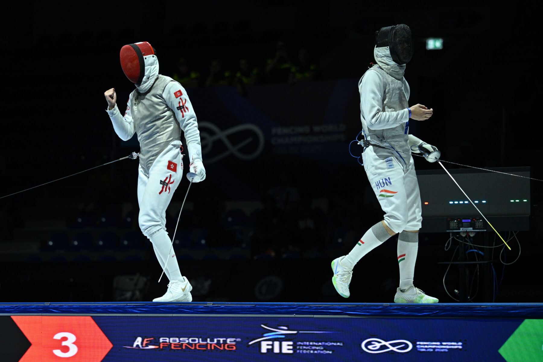 TBILISI, GEORGIA - JULY 22: Chun Yin Ryan Choi of Hong Kong competes against Gergo Szemes of Hungary in the Men's Foil semi-final match during the FIE Fencing World Championships on July 23, 2025 in Tbilisi, Georgia. (Photo by Levan Verdzeuli/Getty Images)