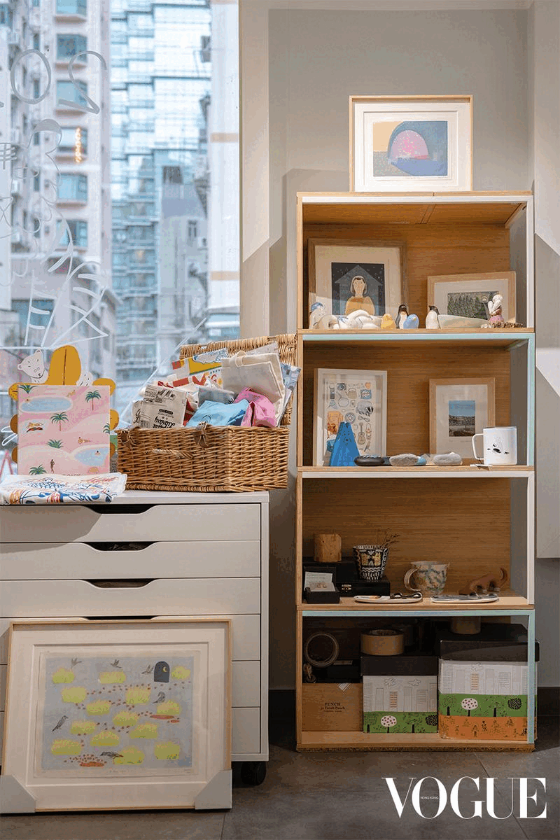 Odd One Out 經營十年,除了不同地區的藝術家作品,同時有來自英國 Warp 的鮮豔奪目明信片、相當搶眼的小飾物和偏向北歐、日本風格的家具用品,更設有陳列限量版藝術書籍的 “Mosses”共享空間,「Odd One Out 還會定期舉辦不同的藝術展覽,一般每個活動籌備大約五個月,其實比大型 gallery 已經短時間得多,靈活性相對較高。年初舉行一個關於『揮春』的展覽,邀請九位插畫師如本地畫家 Onion Peterman、 Charlene Man、Kinchoi Lam 以及來自日本的 Yu Miyama 等製作『揮春』版畫,表達出富有藝術感的揮春不只在農曆新年期間用來應節,更可以成為家中長期擺放的家品,其作品有些是傳統水性木刻版畫來印刷,有些則是絲網印刷,各具特色。」