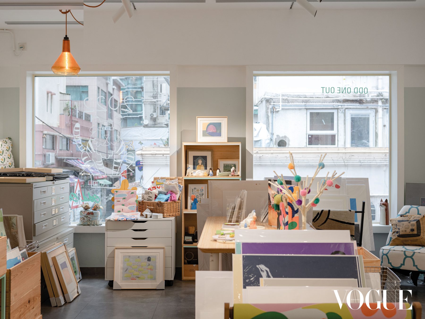 Odd One Out 經營十年,除了不同地區的藝術家作品,同時有來自英國 Warp 的鮮豔奪目明信片、相當搶眼的小飾物和偏向北歐、日本風格的家具用品,更設有陳列限量版藝術書籍的 “Mosses”共享空間,「Odd One Out 還會定期舉辦不同的藝術展覽,一般每個活動籌備大約五個月,其實比大型 gallery 已經短時間得多,靈活性相對較高。年初舉行一個關於『揮春』的展覽,邀請九位插畫師如本地畫家 Onion Peterman、 Charlene Man、Kinchoi Lam 以及來自日本的 Yu Miyama 等製作『揮春』版畫,表達出富有藝術感的揮春不只在農曆新年期間用來應節,更可以成為家中長期擺放的家品,其作品有些是傳統水性木刻版畫來印刷,有些則是絲網印刷,各具特色。」