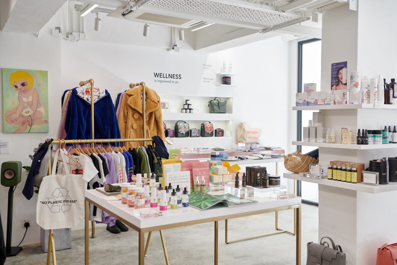 步進店中,映入眼簾的是 select shop 零售空間,精選各種生活精品,包括星級髮型屋SHHH Salon特別調配的護髮系列、本地小店 Laap Zuk 的護膚蠟燭、THE URBAN PLUS 防疫消毒產品、水晶等。當中也有不少是聯乘限定,如 WOMANBOSS 與社區好日子 Good Day Society 合作的朱古力形狀手工皂、設計組合 Florian Wegenast 和 Christine Lew 特別以象徵火焰的粉紅色來設計的限量版「Hong Kong Brick」等。選貨以環保、身心靈健康、藝術文化等為大前提,也會由團隊率先試用產品,才決定引入。當中有來自美國及其他國家,也有很多香港本地創立的品牌。「絕大部分品牌都由女性創立,不過我們沒有特意優待,只是想待人平等,提升有時被社會小覤的力量。同時透過網店,香港本地品牌亦有機會接觸到海外的客群,達到我們一直深信的『互信互贏』效果。」