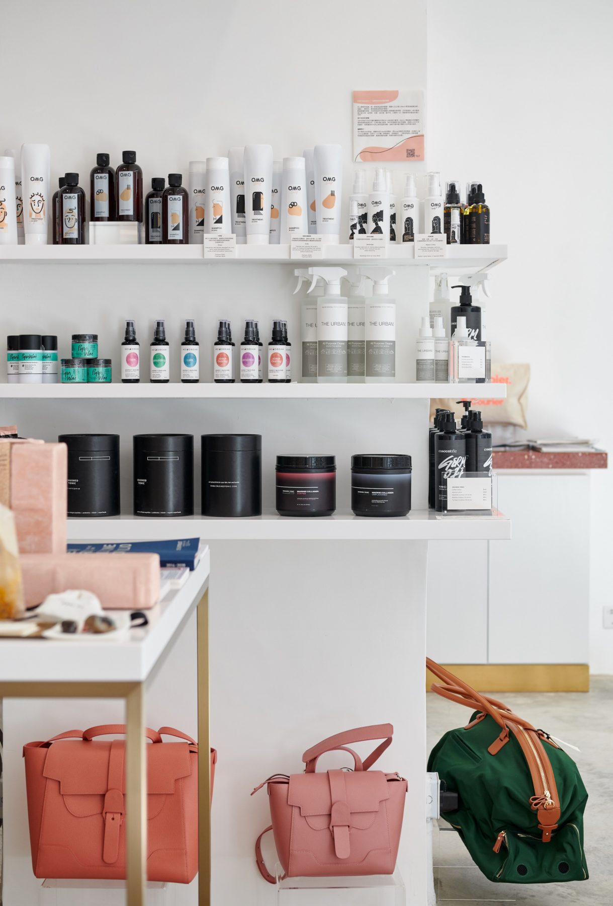 步進店中,映入眼簾的是 select shop 零售空間,精選各種生活精品,包括星級髮型屋SHHH Salon特別調配的護髮系列、本地小店 Laap Zuk 的護膚蠟燭、THE URBAN PLUS 防疫消毒產品、水晶等。當中也有不少是聯乘限定,如 WOMANBOSS 與社區好日子 Good Day Society 合作的朱古力形狀手工皂、設計組合 Florian Wegenast 和 Christine Lew 特別以象徵火焰的粉紅色來設計的限量版「Hong Kong Brick」等。選貨以環保、身心靈健康、藝術文化等為大前提,也會由團隊率先試用產品,才決定引入。當中有來自美國及其他國家,也有很多香港本地創立的品牌。「絕大部分品牌都由女性創立,不過我們沒有特意優待,只是想待人平等,提升有時被社會小覤的力量。同時透過網店,香港本地品牌亦有機會接觸到海外的客群,達到我們一直深信的『互信互贏』效果。」
