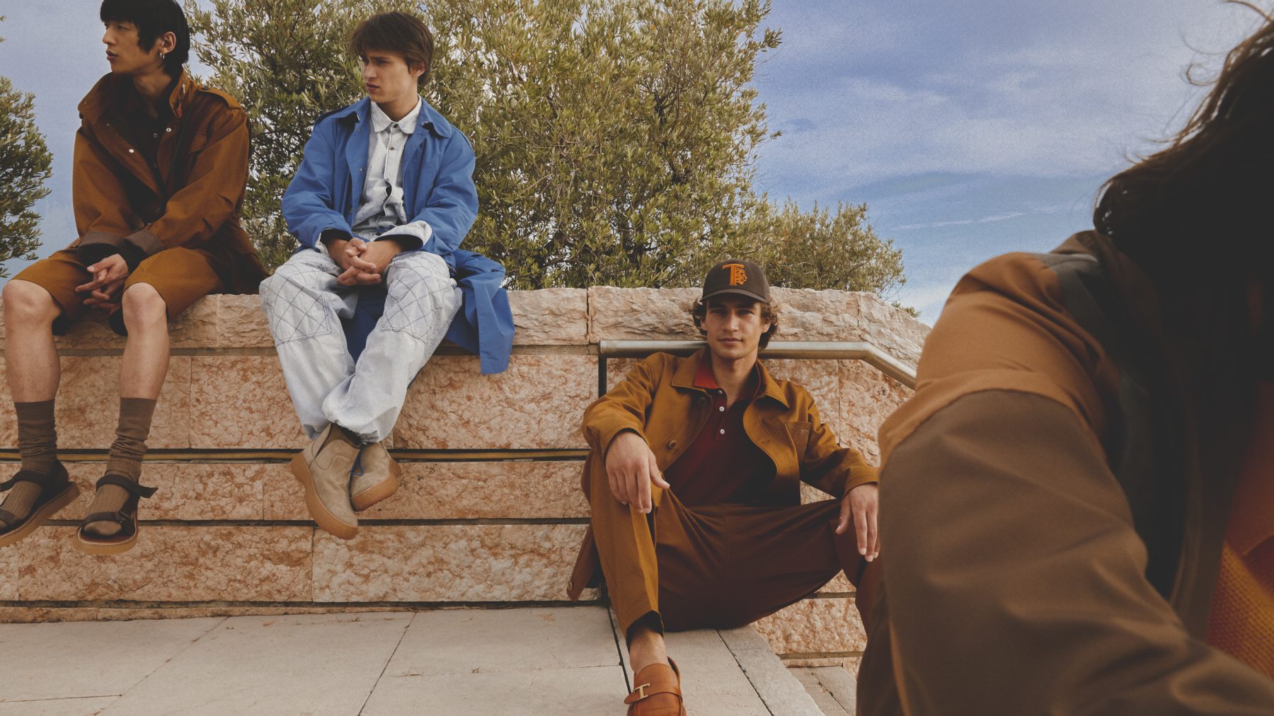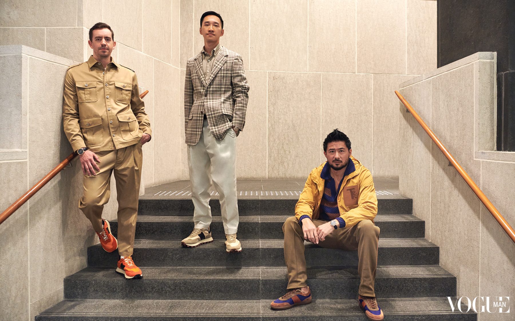 Evan Chow: Jacket, shirt, trousers, sneakers, Tod’s. Boné Kizuna: Jacket, knitwear, trousers, sneakers, Tod’s. Christopher Owen: Jacket, trousers, sneakers, Tod’s.