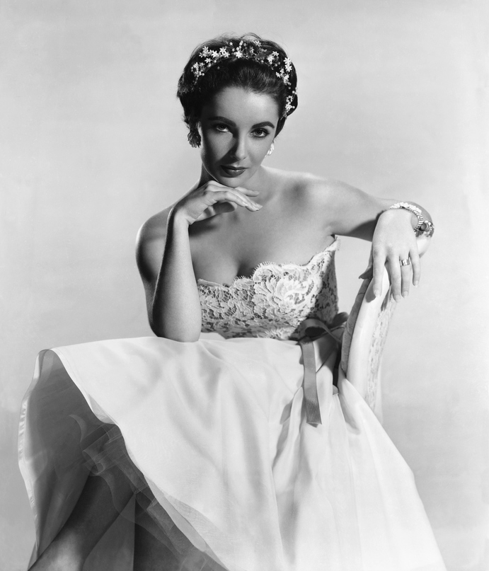 (Original Caption) 1956-Actress Elizabeth Taylor is shown seated, wearing a wedding gown-like dress and a pretty tiara. (Photo by George Rinhart/Corbis via Getty Images)