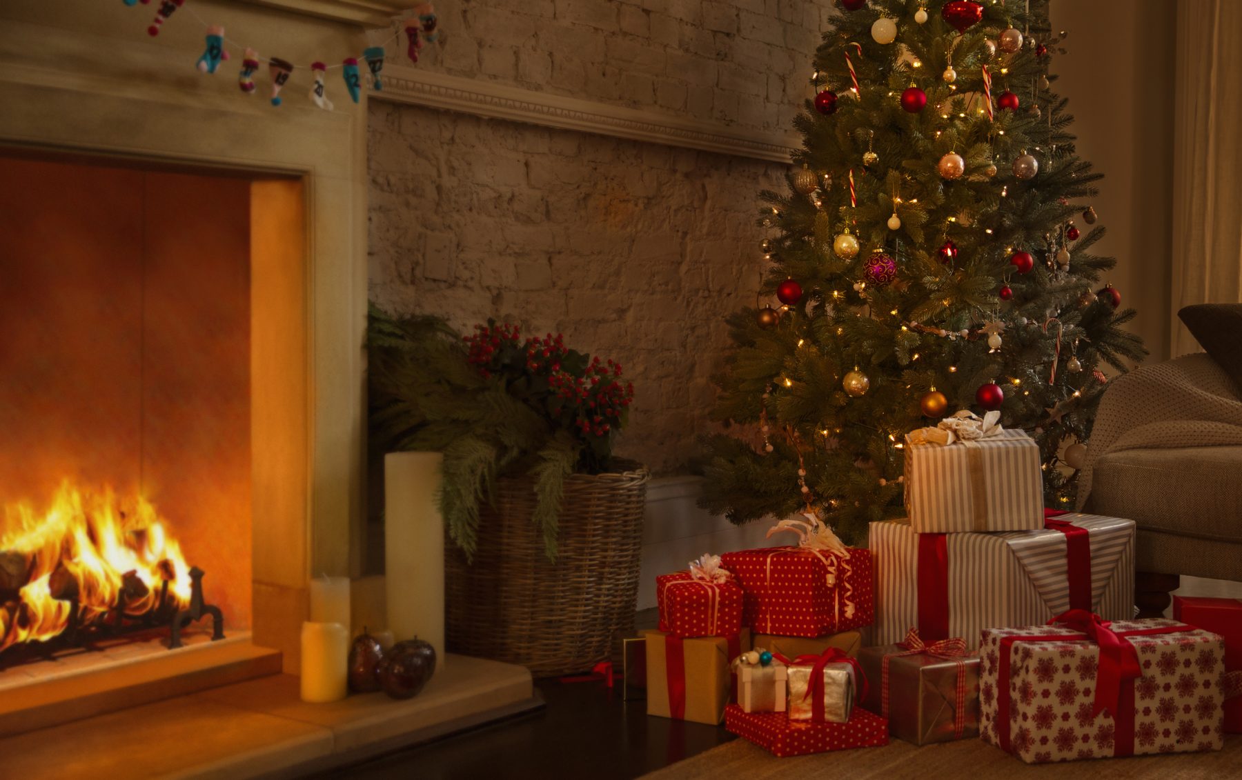 Christmas tree and gifts near fireplace in living room
