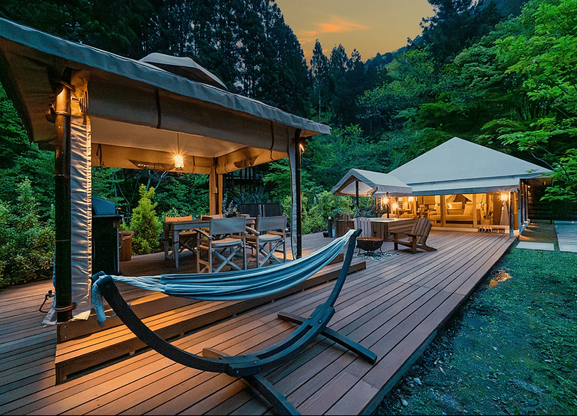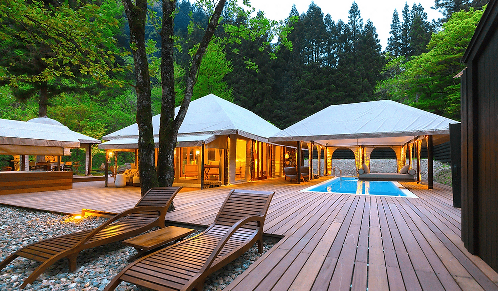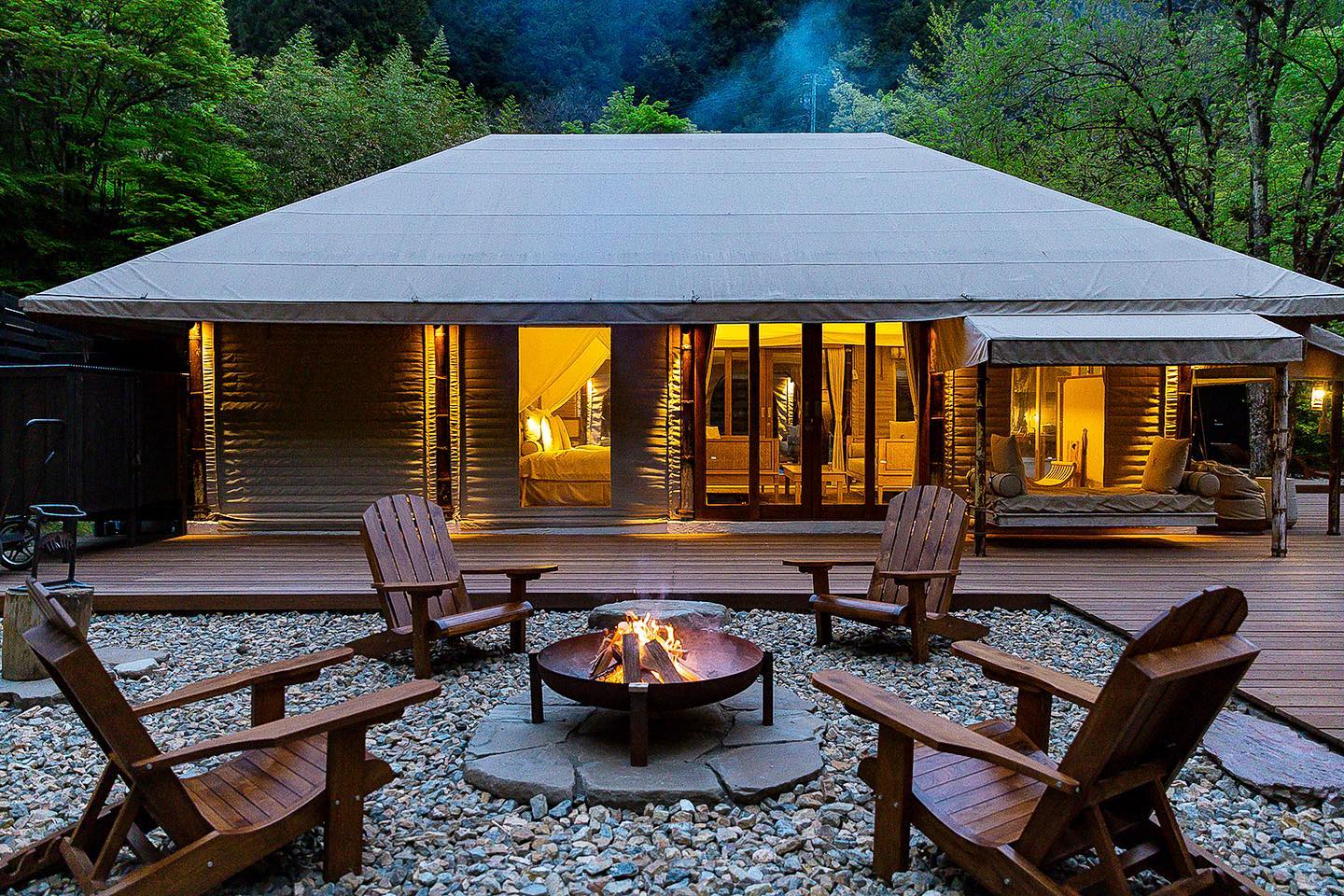 位於東京近郊多摩區檜原村的Keikoku Glamping Tent是日式風格豪華露營,擁有媲美五星級酒店的豪華露營設施,以及日本原生的自然美景的營地。露營地坐落於清澈的溪流旁,被群山環抱。住客可參與各種戶外活動,如捕魚、騎馬、漂流、瀑布冥想等,領略大自然的種種魅力。