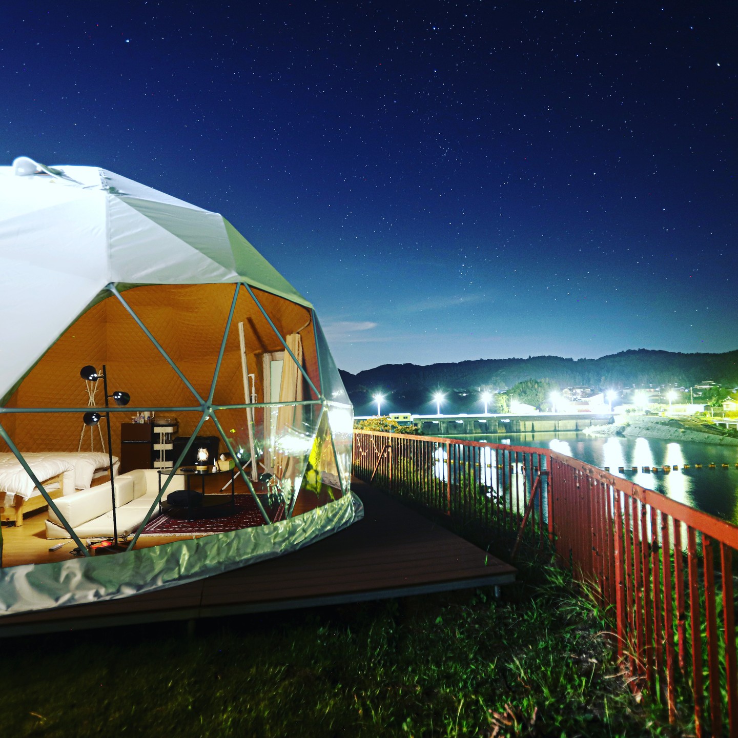 Glampark龜山溫泉是一個位於千葉縣君津市的豪華露營勝地,距離東京市中心70分鐘車程。這裡結合了露營和溫泉的獨特體驗,享受大自然的寧靜與放鬆。這個私人Glamping場地每次只接待一組客人,確保了極高的私密性。特大圓頂帳篷直徑6米,設有冷暖空調,全年都能提供舒適的露營體驗。此外還有一個100%天然的私人溫泉,溫泉水富含美容成分,非常適合女士們沉浸其中,在放鬆身心的同時欣賞湖光山色。