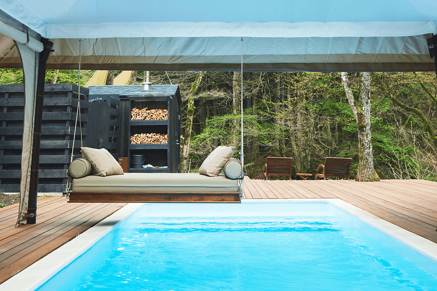 僅有兩棟獨立的帳篷式住宿單元,設計風格採用極簡日式的風格,進入帳篷內會被其寬敞的空間和精緻的設計所驚艷。帳篷內配備了冷氣、獨立衛浴間、夢幻的公主床等一應俱全的設施,大大提升住宿的舒適體驗。而且帳篷外還設有私人花園和私人泳池,裡面設有專屬的烤肉區和按摩浴缸,在星空下放鬆身心,真是太奢華了!