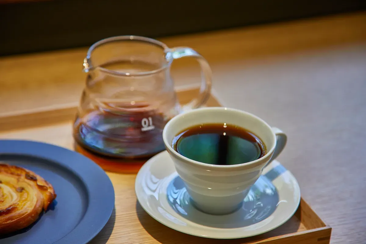 這款咖啡味道醇和,與來自名古屋的烘焙店「パインフィールズマーケット」提供的芝士蛋糕和巧克力特里紐搭配,味道相得益彰。店內還展示了以鳥獸戯畫為設計靈感的京風手繪濾杯,並有為了傳承工匠手工技藝而創立的「HARIO Lampwork Factory」美麗的玻璃配件。