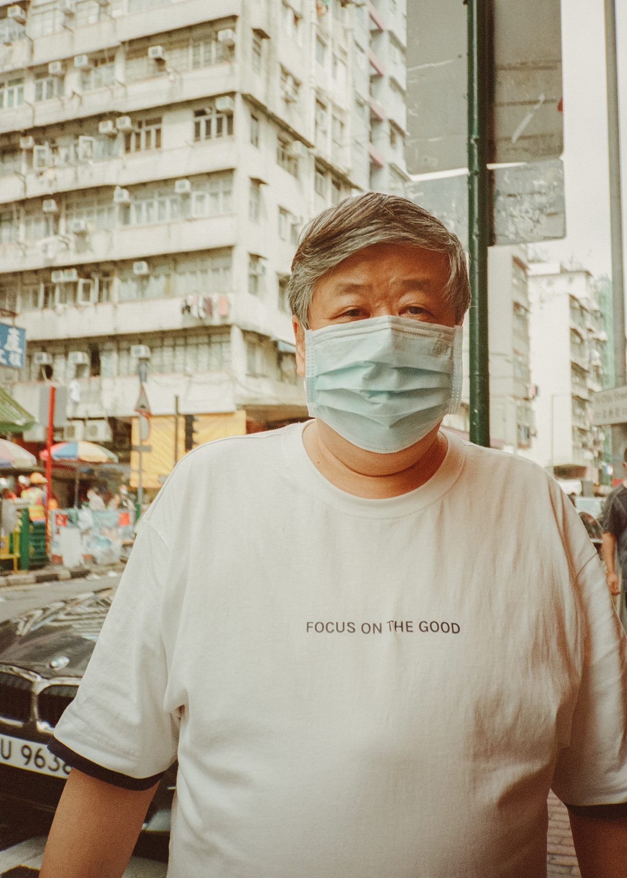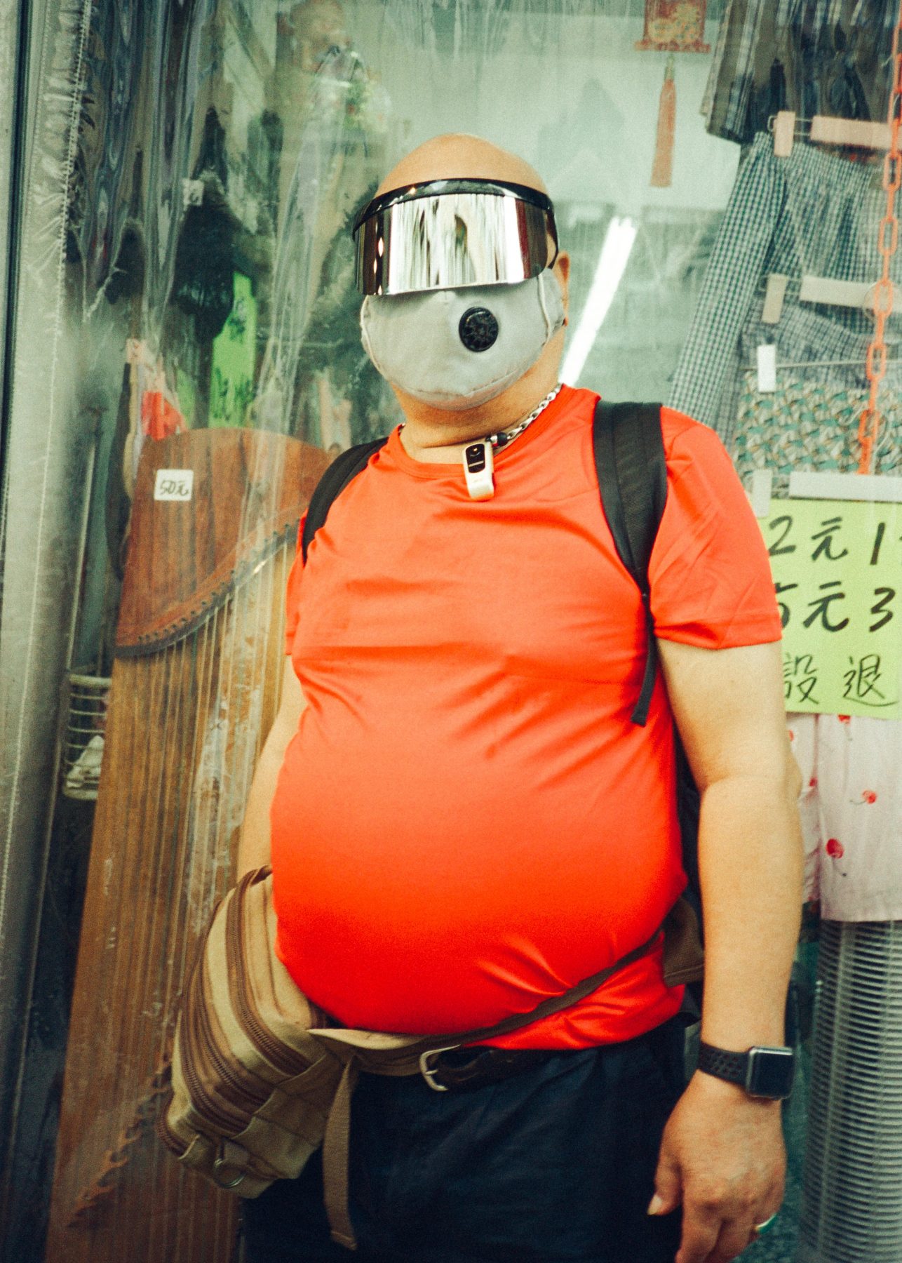 雖說並沒有特地挑選拍照地點,但 Leungmo 坦言深水埗始終是她最喜愛的取材地方。「相比中環、銅鑼灣一帶的人穿衣服偏向品牌與潮流,深水埗的人們實在有趣太多了。很多街坊都有各自一套風格與個性,他們也不理別人目光,完全忠於自己的喜 好,將個人風格成為一種 statement。」於是路人的穿衣日常成為了她鏡頭下的恆常主題,從充滿創意的防疫裝備、超脫常理的配襯方式、到叫 Leungmo 完全着迷的 slogan tee。「他們身穿的 slogan tee,都有着意義非常宏大的字句。有時遇上心情煩燥或低落的日子,那些 slogan 更成為了人生的答案。」“I Love Hong Kong”言簡意賅,“Focus on the good”是正面提醒,「香港穩百業興」不就是元首級寄語。「好幾次讓我本來難過的心情馬上輕鬆了不少。」上天從沒給你指引?也許是你看得未夠仔細。