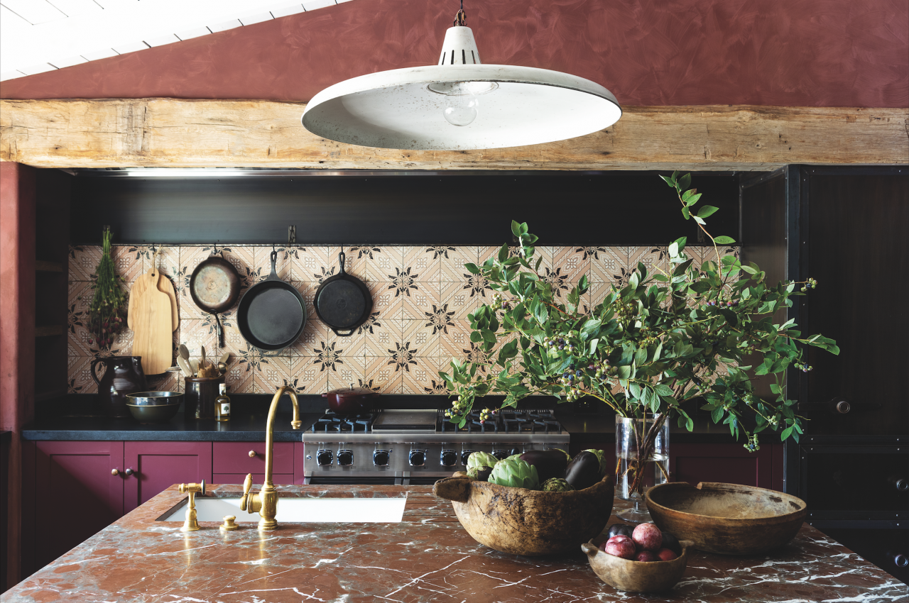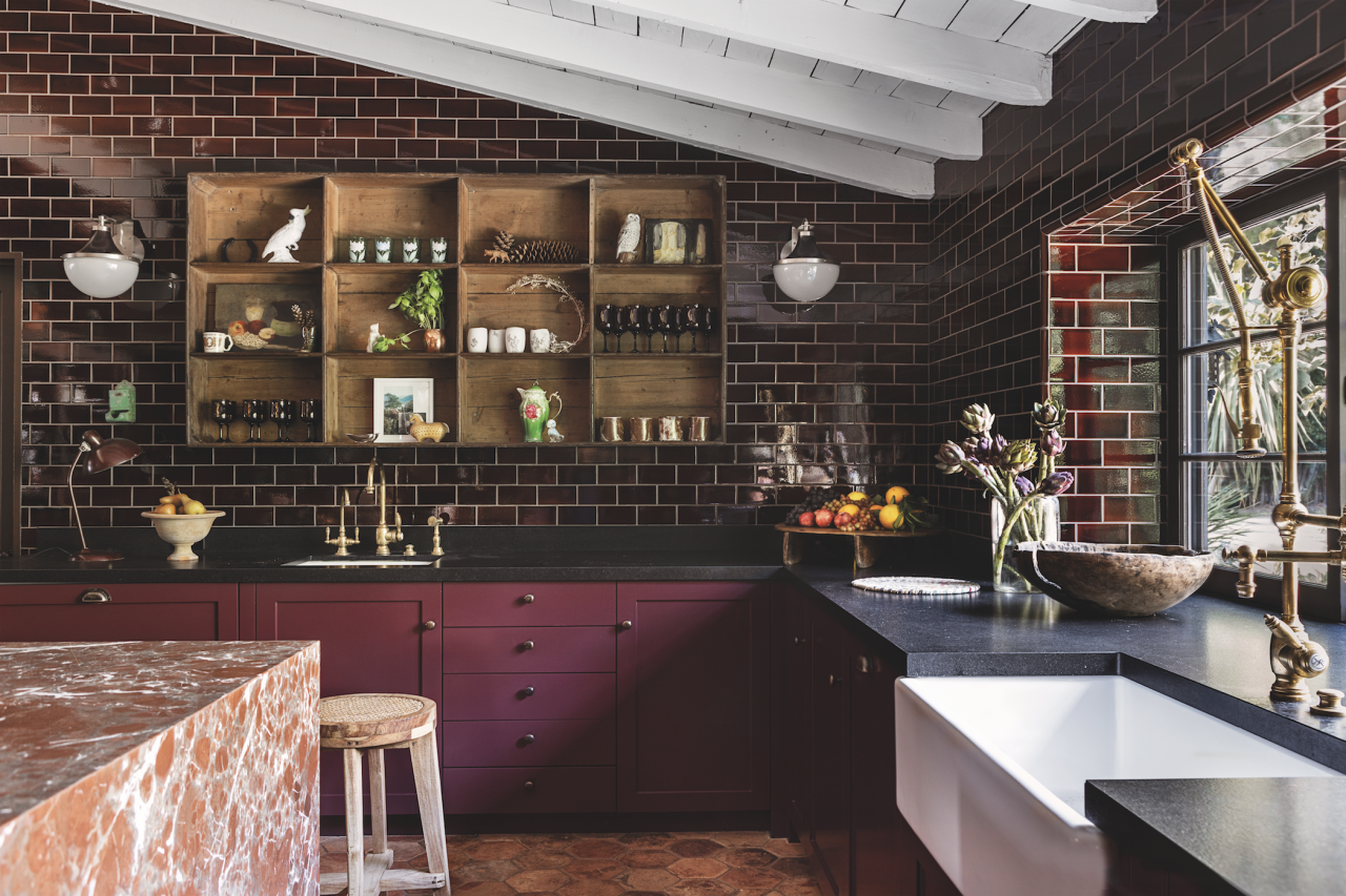 來自Waterworks的茄子色牆磚, Chateau Domingue的19世紀 陶土地磚,Compas Stone的大理石,Nickey Kehoe的儲物架, 以及來自Galerie Half的Pierre Jeanneret凳子,組成了充滿格調的廚房。