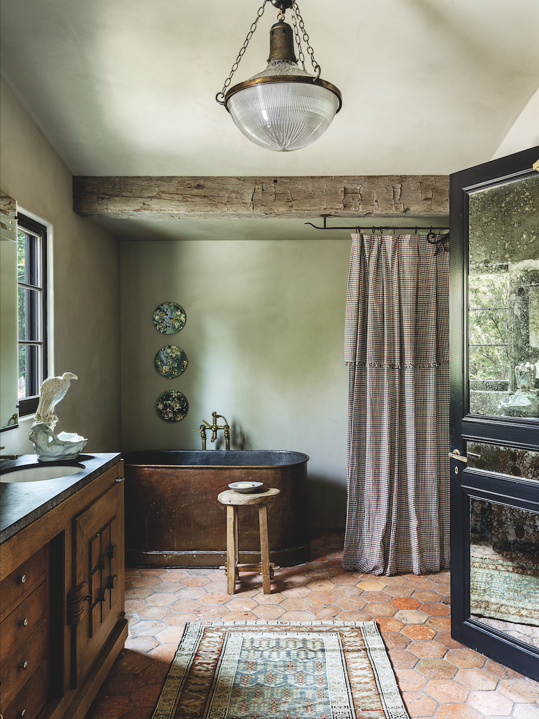 浴室配備了一個19世紀的銅製浴缸及Watermark燈具,洗手盆則來自Charles Dudouyt。