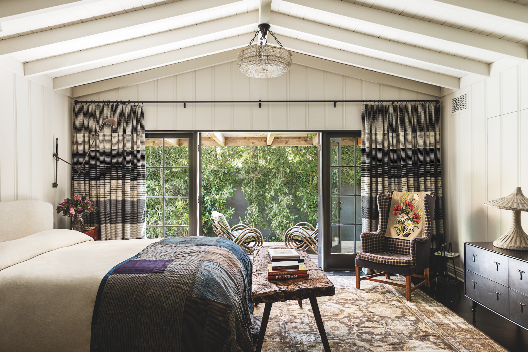 主人房中,來自Nickey Kehoe的長椅 和Kaare Klint的arm chair擺放在來自 Woven的Sultanabad地氈上。櫥櫃由 BDDW設計,1930年代的水晶吊燈則來 自Blackman Cruz。