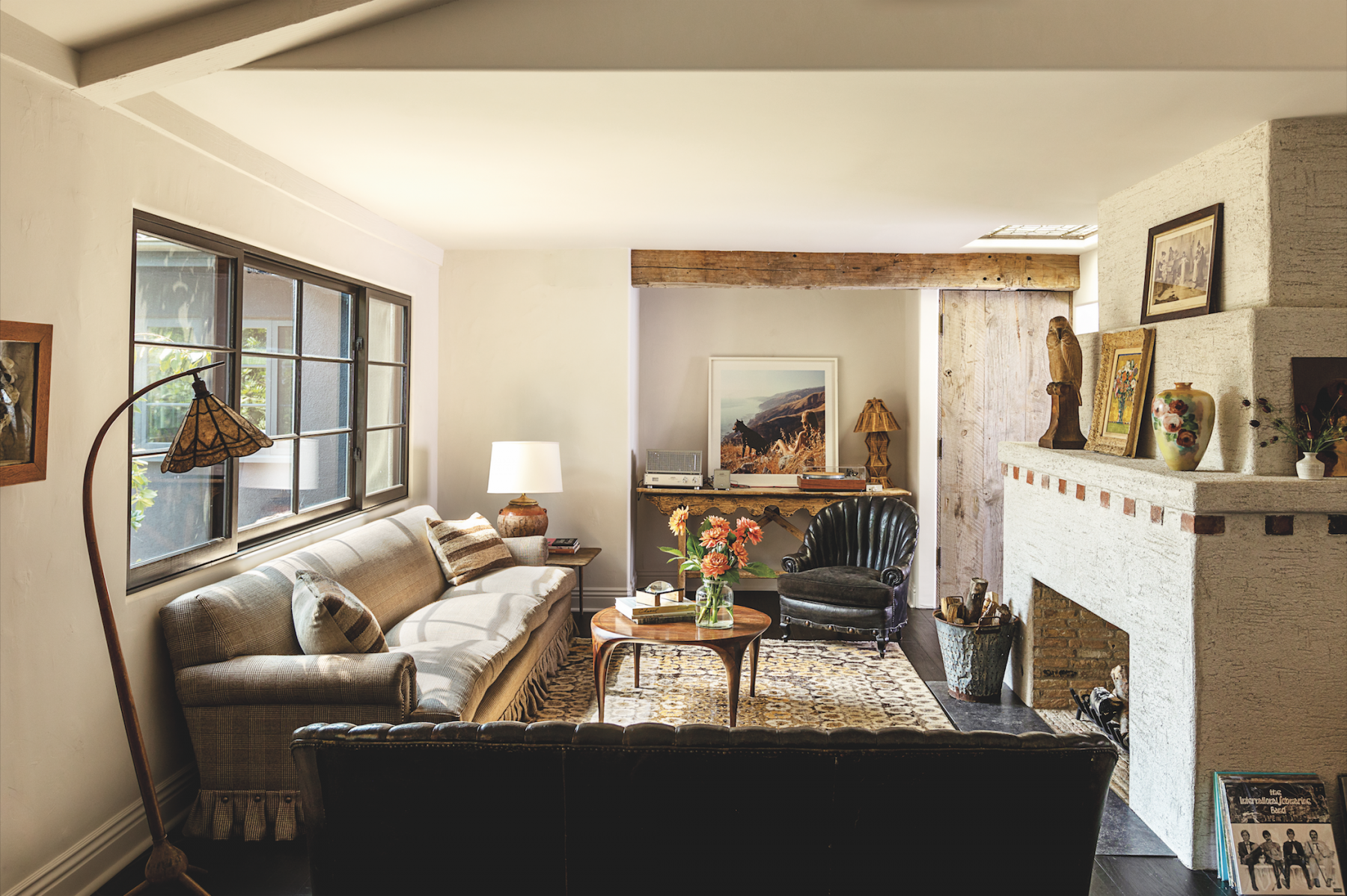 溫暖的客廳中有來自JF Chen的維多利亞式皮革梳化,Rewire的Victor DiNovi雞尾酒桌和 Severin Hansen落地燈並置;遠處牆上的照片 是Hunter S. Thompson的作品。