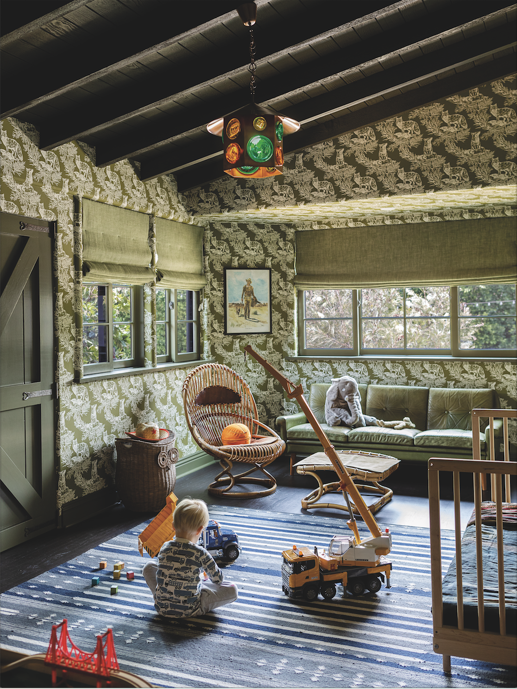 嬰兒房貼上了Lake August 的牆紙,配襯復古Erik Höglund吊燈,以及Crate and Barrel的貓頭鷹籃子。