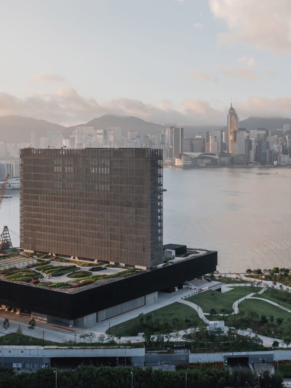 由著名建築事務所Herzog & de Meuron操刀的建築群沿用粗野主義(Brutalism)風格,當中也滲入了不少香港特色;如外牆的構造,就啟發自自竹子的形態。