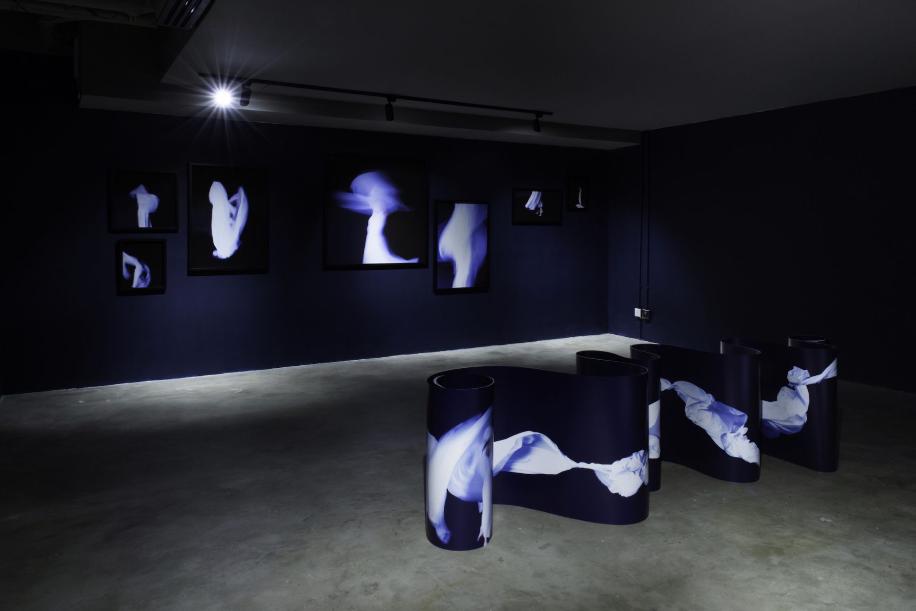 按下快門,每個肢體及表演服裝的動態被捕捉,重新看到的形狀,抽象而又新穎。深色背景與淺色服裝形成強烈對比,讓人專注感受作品定格的那一瞬間,提醒大家表演時被忽略或忘記的各種細節。現場還有彎曲的裝置藝術,同樣印有作品。