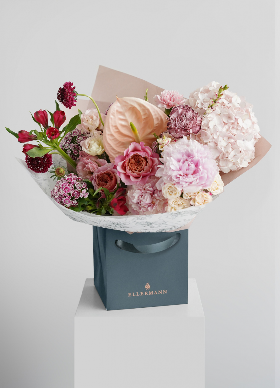 這款插花採用了層層疊疊的粉紅色鮮花,粉紅牡丹、粉繡球、康乃馨、玫瑰、紅掌、桔梗等,色調柔和嬌嫩,洋溢愛與感激的情感,是言語不足以表達時的最佳選擇。