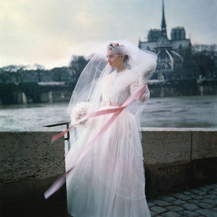 巴黎圣母院前的模特兒,身穿Balmain禮服 Photo by Genevieve Naylor / Corbis via Getty Images