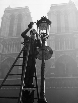 一名市政僱員在巴黎圣母院前的街頭換燈泡。 Photo by Charles CICCIONE / Gamma Rapho via Getty Images