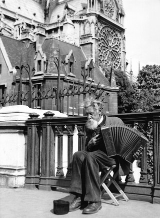 巴黎圣母院前的手風琴家。 Photo by Serge DE SAZO / Gamma-Rapho via Getty Images