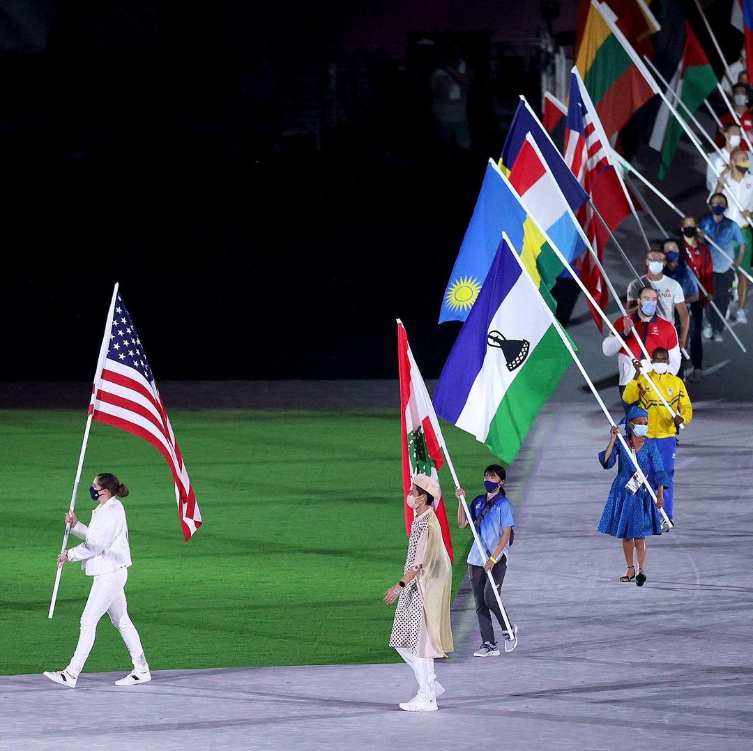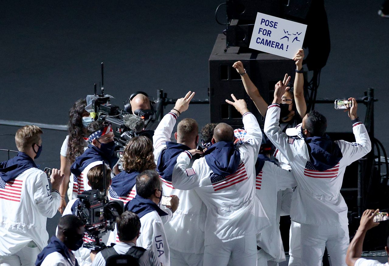 TOKYO, JAPAN - AUGUST 08: Members of Team United States pose for the host broadcast cameras during the Closing Ceremony of the Tokyo 2020 Olympic Games at Olympic Stadium on August 08, 2021 in Tokyo, Japan. (Photo by Leon Neal/Getty Images)