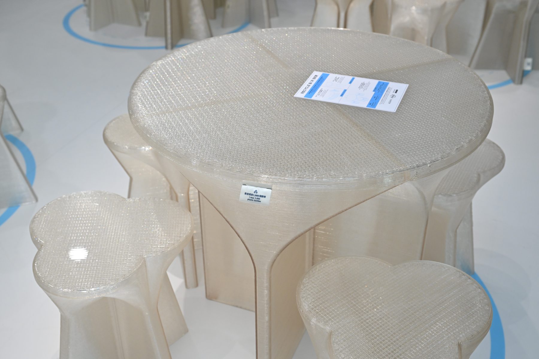 「回收吧」顧名思義的是整個裝置是回收了18,000 個塑料膠樽,透過 EDITECTURE 所引進了香港最大的升級再造3D打印機打造出30多件傢俱而成。讓人驚艷的是,整個裝置的原材料高達95%是環保物料,同時在生產過程中所產生的廢料不到5%;除了裝置設計之外,同場也設置飲料包裝的回收收集箱,開宗明義地教育港人如何正確地回收,貫徹始終地實行可持續發展的核心。