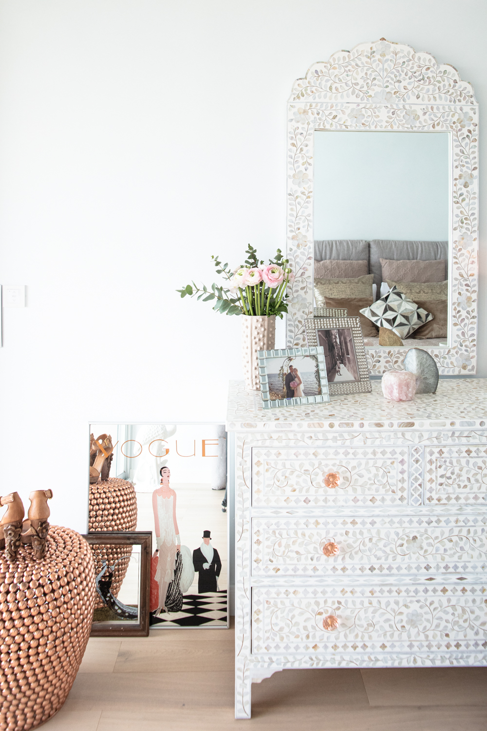 摩納哥作為與法國南部接壤的小國,擁有長長的海岸,幾乎每一個角落都能俯視蔚藍的地中海;這也成為了 Sarah 對新居設計的靈感。「我希望有大量色彩,充滿活力,異國情調和不拘一格的家具。」以倫敦現有的家具為基礎,再從古董市場和小精品店中搜羅寶藏;當中有不少是陪了 Sarah 半輩子的家品。「這面 Art Deco 復古 Vogue 鏡子,屬於1970年代初的設計,是母親留給我的。它從我在倫敦的第一個家開始,一直跟着我到現在。」