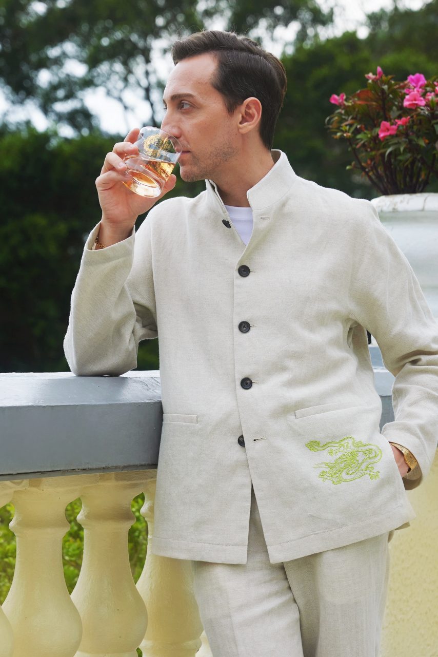 TANG WOOL-LINEN JACKET WITH DRAGON EMBROIDERY & TROUSERS