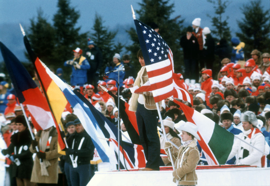 Eröffnungsfeier der Olympischen Winterspiele in Lake Placid im US-Bundesstaat New York am 13.02.1980. Der amerikanische Eisschnellläufer Eric Heiden spricht den Olympischen Eid für die teilnehmenden Sportler. (Photo by Hartmut Reeh/picture alliance via Getty Images)