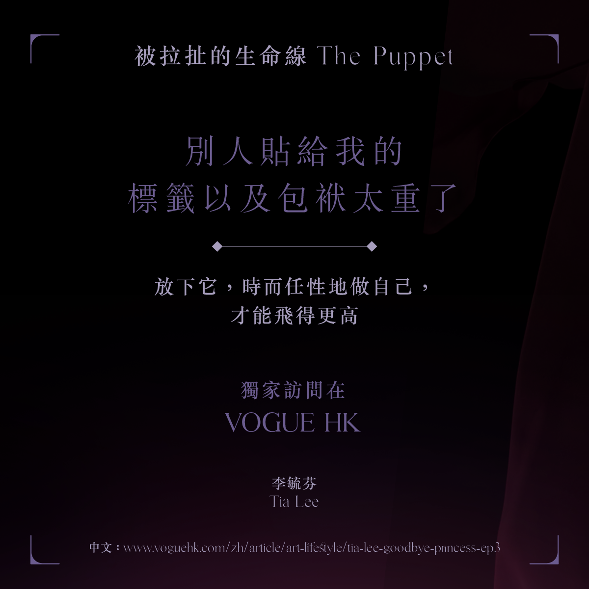 經歷人魚少女脫尾,從落難少女搖身一變成為公主,距離夢想一步之遙,登上舞台受萬千寵愛,現實卻是猶如扯線公仔,活在他人設定的框架中,身不由己成為「木偶姑娘」在演藝圈生存。跌宕起伏的人生飽受各樣的考驗,木偶姑娘能勇敢面對內心掙扎,決心跳出他人對自己設定的框架及標籤嗎?Tia認為:「之後我發現是自己太在意別人的看法,很多時候每做一件事都是為了博取大眾的喜愛,為了得到從別人而來的肯定而活,這樣的生命態度實在是太不健康了,也讓我慢慢失去了自己最原本的樣貌。」