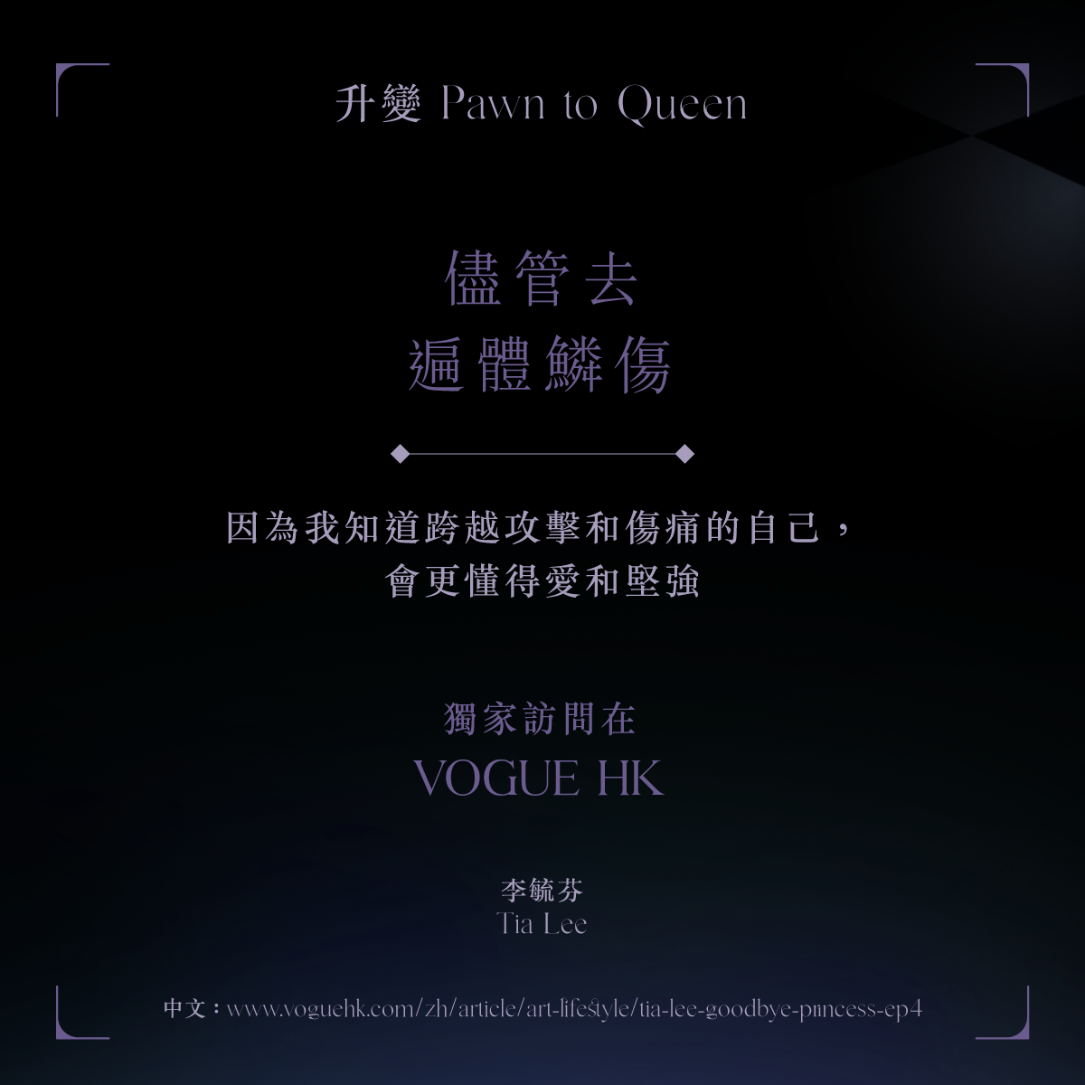 Tia 學懂從挑戰中成長,昇華自己,她說:「因為我有看 Netflix 劇集《后翼棄兵》,所以我特別喜歡第四集中角色被象徵流言蜚語的棋子襲擊的意象面對瘋狂的攻擊,女主角沒有離開棋盤、沒有逃避規則,反而是逆流走到彼岸,最終成為了更好的自己。」Tia感慨道︰「不論在演藝圈、還是在我生活中的世界,都有兩種反抗的態度。你可以憤怒地離開棋盤,與世界各走各路。這無疑是很帥的,但更帥的難道不是風蕭蕭兮易水寒,縱千萬人而吾住嗎?跨越了攻擊和傷痛,自己也會昇華。」