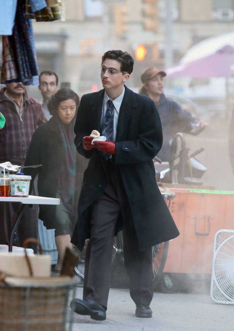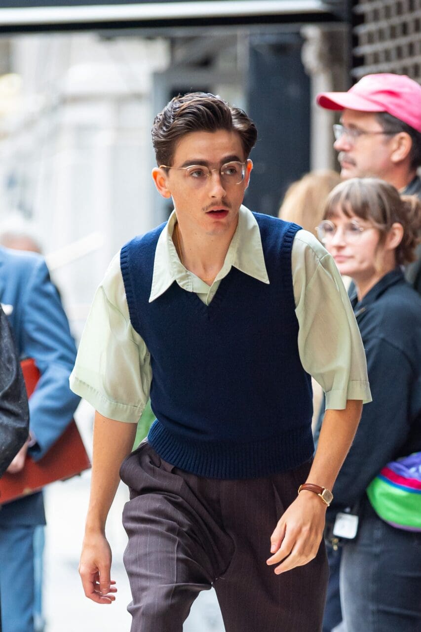 近日有關電影的消息,終於傳來第一張令不少人驚訝的照片,因為不少人都未見過照片中的Timothée的樣子——那個戴著鋼邊眼鏡,留著小胡子,衣著怪異的小子。不論這部電影將會是 40 年代的《原鑽》 ,還是令人心跳加速、一分鐘一英里的《失速夜狂奔》 的感覺,看到男主角這一身造型美術,筆者都已經被它征服了。