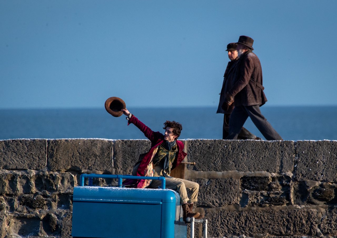 LYME REGIS, ENGLAND - OCTOBER 12: Timothée Chalamet is seen as Willy Wonka leaving the ship on the top of a van during filming for the Warner Bros and the Roald Dahl Story Company's upcoming movie 'Wonka' on October 12, 2021, in Lyme Regis, England. This film will focus on the young Willy Wonka on his earliest adventure and how he met the Oompa-Loompas. (Photo by Finnbarr Webster/Getty Images)
