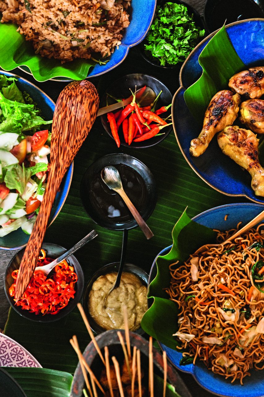 Travel feature on Gili Islands in Indonesia, view from above, multiple bowls with food and dishes, rice, noodles, chili peppers, chicken legs, diet, cooking, salad, green and blue