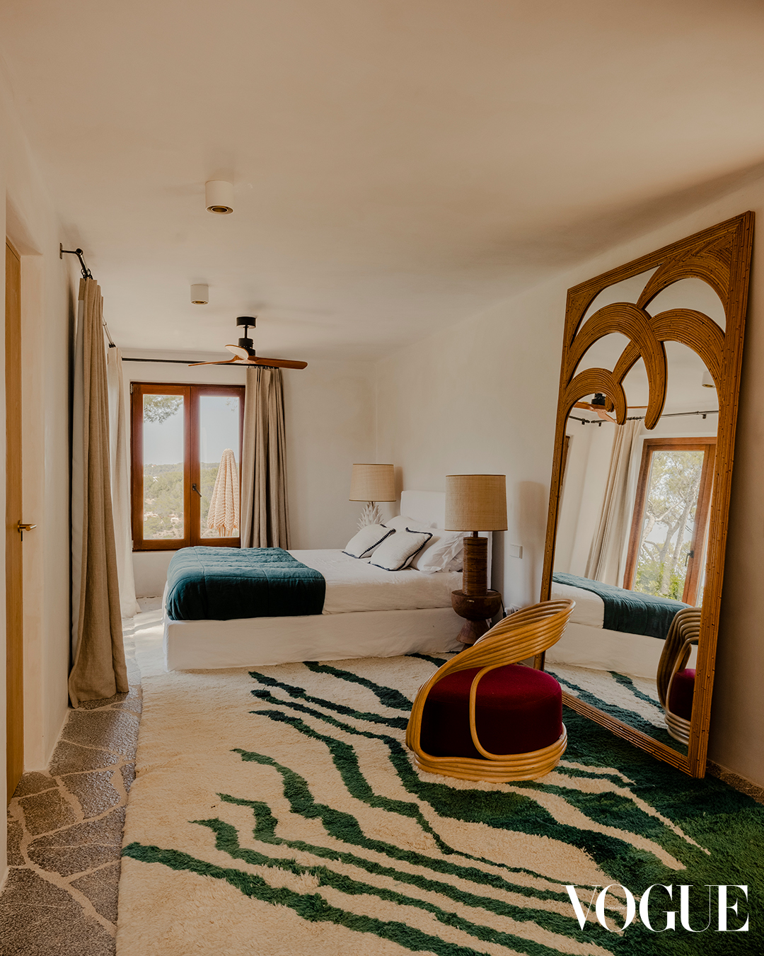 「睡房俯瞰着花園和大海,令人非常放鬆,我在這裏睡得很好。」一開始,睡房其實是廚房的一部分,有一個小窗戶。 Victoria 開闊了睡房的空間,亦增加了大窗戶,讓房間充滿自然光線,並欣賞到寧靜的海景。Beni Rugs 的毛絨訂製地氈,與客廳畫作的亮綠色互相呼應;而訂製的赤土椅子和燈光柔和的陶瓷松錐燈,則增添了房間的舒適氛圍。「顏色是很重要的,因為它能為房屋增添一些深度和個性。」Victoria 沉思道:「房子裏所添加的顏色強烈地反映了我個性和風格,同時亦保留了 Ibiza 的精神。」