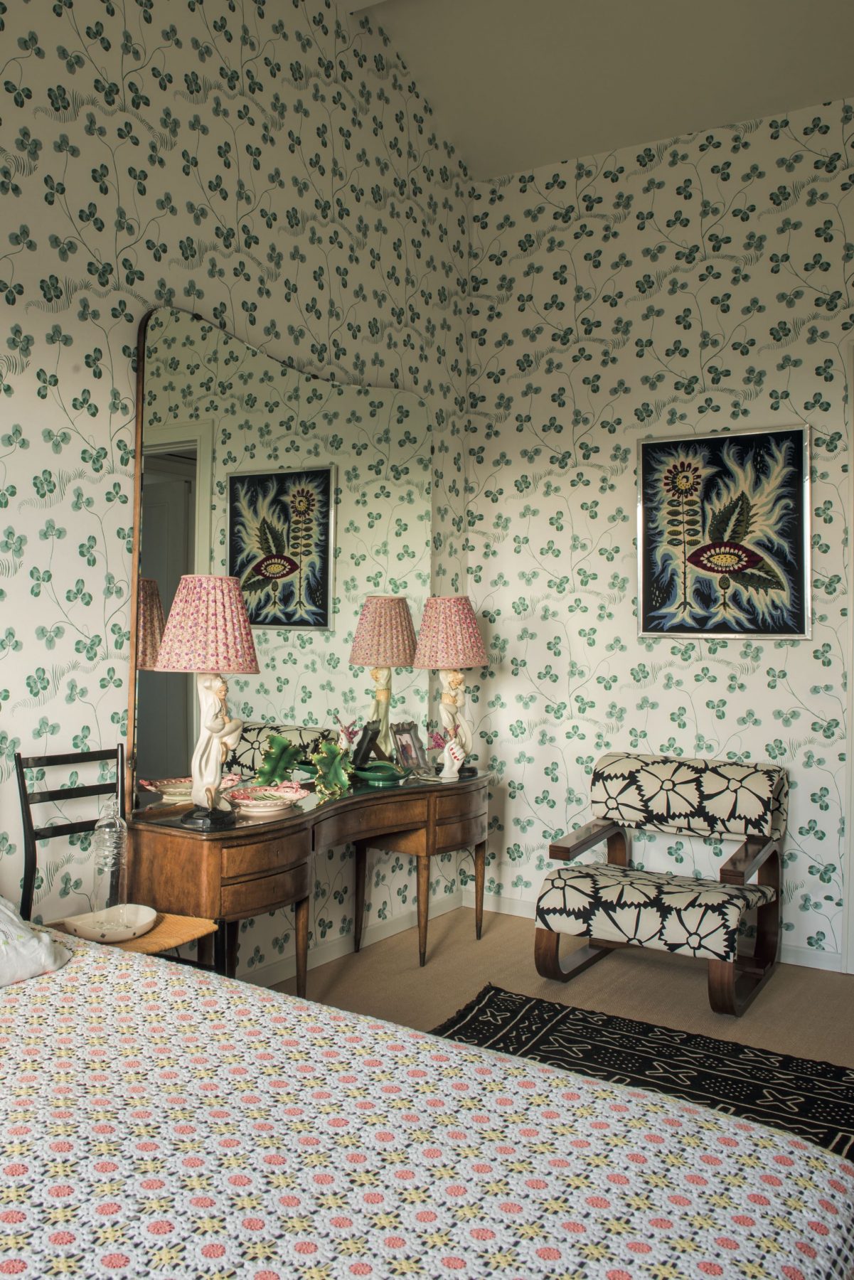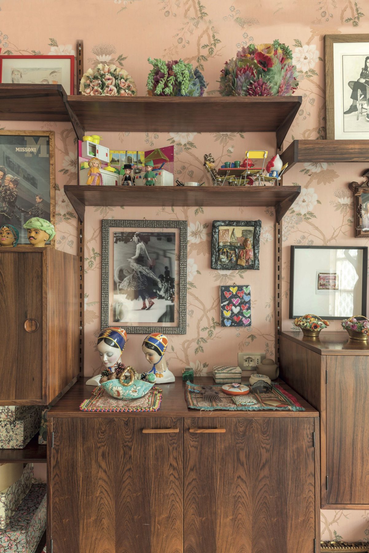 Missoni Amos混搭家具,精緻卻不拘一格。她在網上和跳蚤市場找來不同作品,她與母親和祖母同樣熱愛這購物方式。在客廳裏,Missoni Amos將Andrea Branzi的戲劇性玻璃書架與20世紀50年代的花卉椅子,並排而列,互相輝映。空間像一個舞台,讓家具盡情四處跳躍,發光發熱,天鵝絨柔和的藍色沙發,購自eBay;沙發底的地毯,描繪了中國十二生肖的象徵,Missoni Amos狡猾地笑着,分享她如何擁有這件作品:這是為Missoni Home設計的樣版。 「我跟陳列室借來,說要拍照,把它放在客廳後,我邀請祖母來看看如何完美,她別無選擇,只能留給我。」