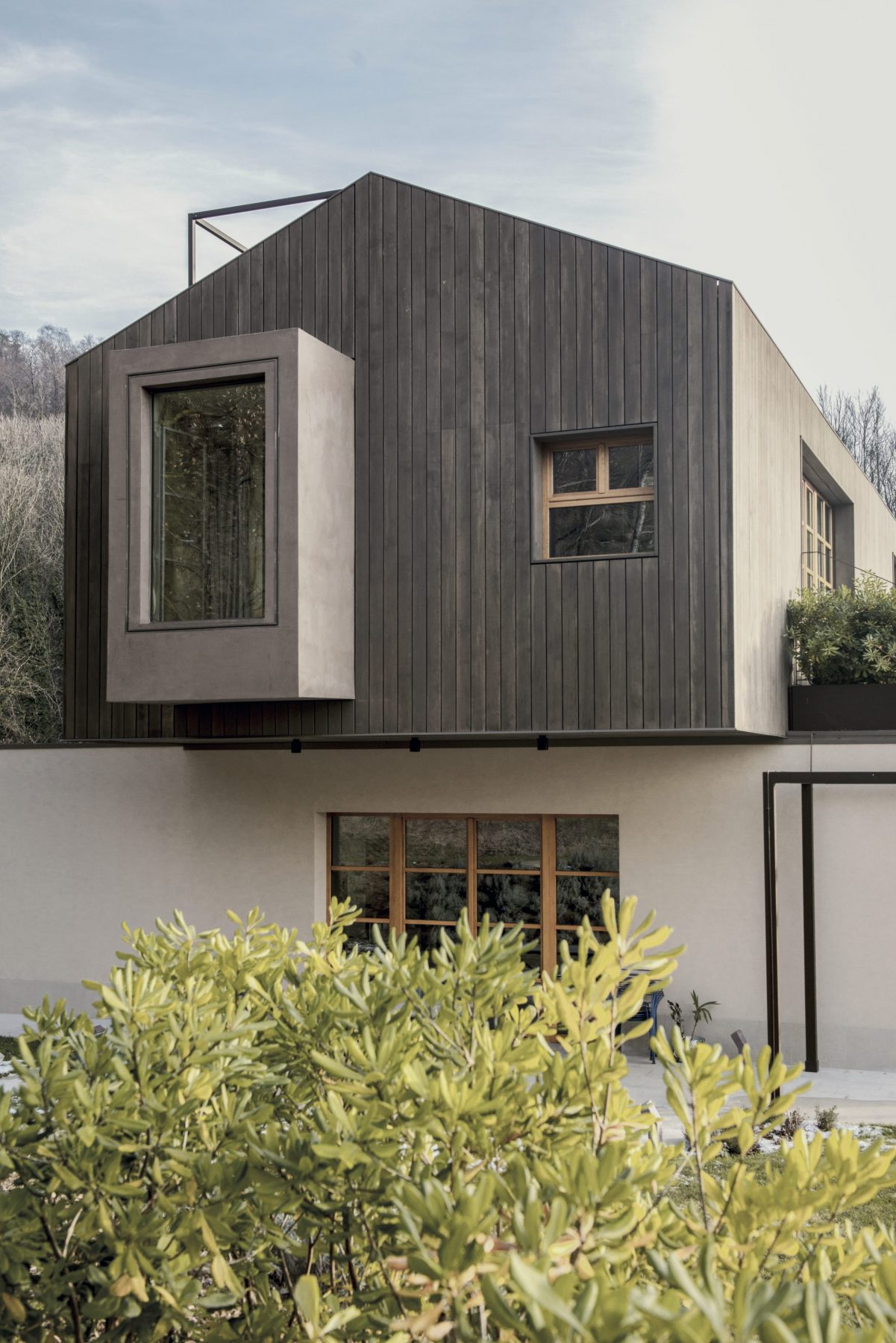「我和丈夫討論過後,最終只專注於我們兩人都喜歡的元素。」Missoni Amos說道,「我們有本筆記簿,記錄了我們兩人都喜歡的參考圖片:外牆的石頭和木頭,長線型吊燈和兩面客廳。建築沿着山坡傾斜。它是一個長長的懸浮體,完全用木頭包裹,屋頂像人字形,甚具特色,可容納更私密的空間。」