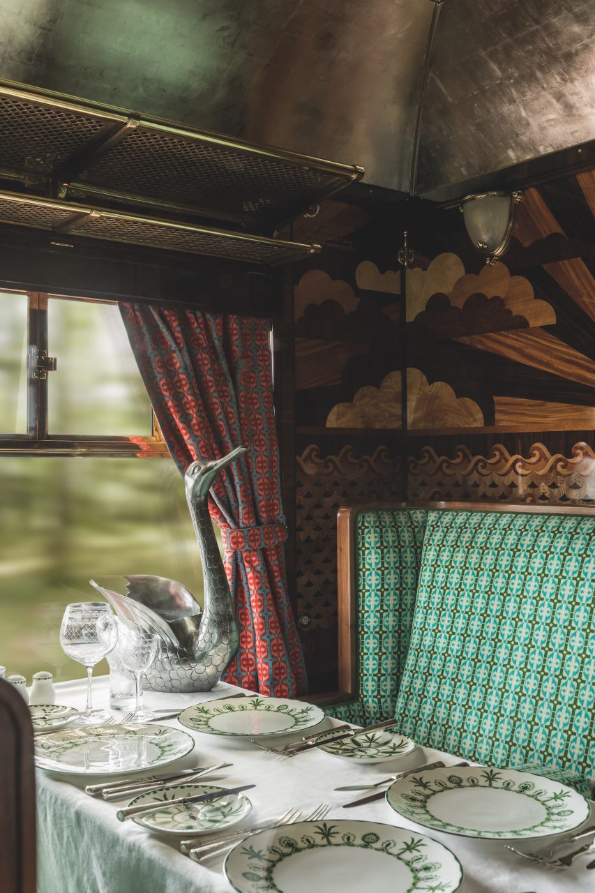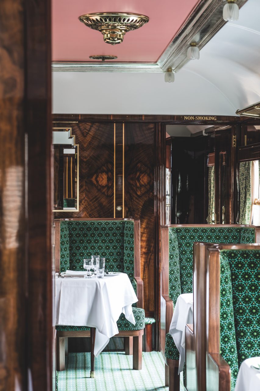 天花板上的佈置精巧的銀葉折射出水一樣的倒影,天花板中間的粉紅色、毛絨紡織品、寬敞復古的椅子、車廂內的擺設如天鵝形狀香檳冰桶等,更是充滿巧思。綠色再次出現在導演選擇的訂製陶器和私人包間的天花板上;華麗細緻的鑲嵌工藝保留了車廂原有的裝飾藝術風格。