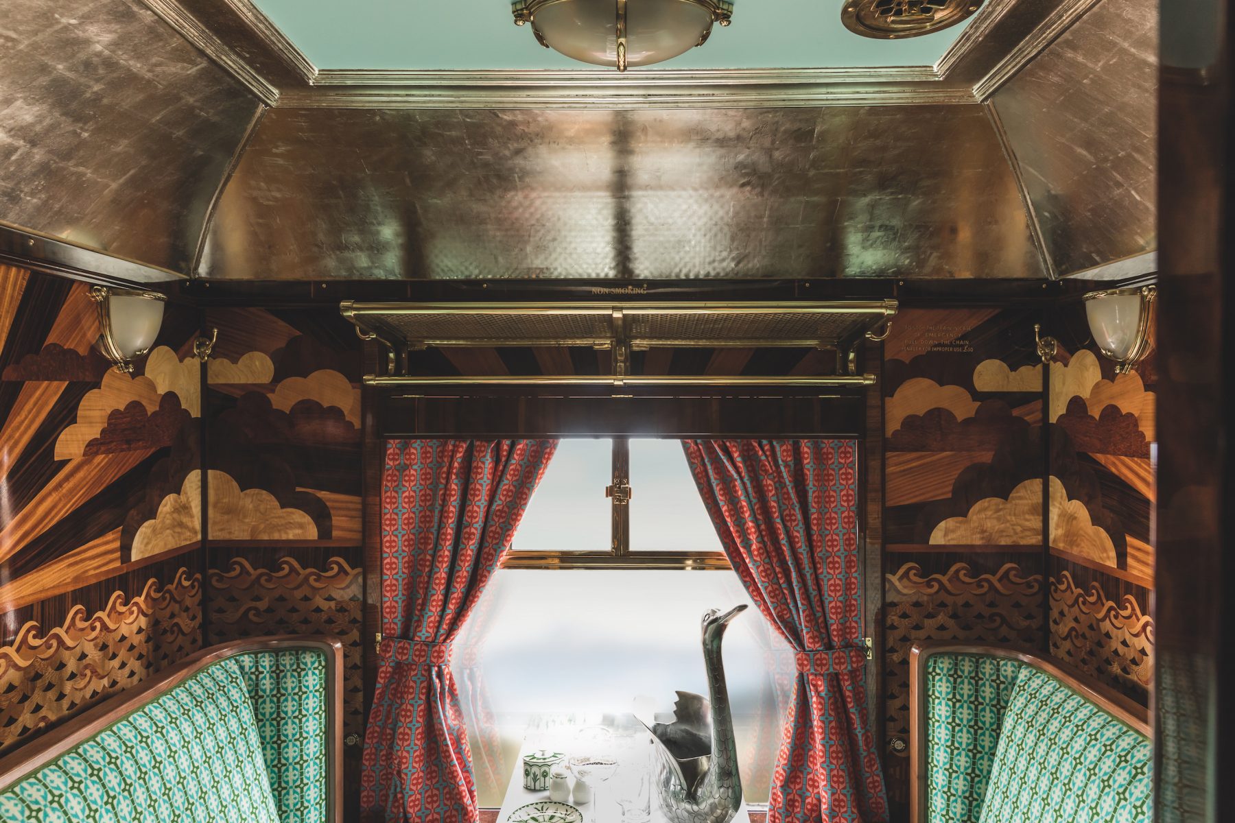 天花板上的佈置精巧的銀葉折射出水一樣的倒影,天花板中間的粉紅色、毛絨紡織品、寬敞復古的椅子、車廂內的擺設如天鵝形狀香檳冰桶等,更是充滿巧思。綠色再次出現在導演選擇的訂製陶器和私人包間的天花板上;華麗細緻的鑲嵌工藝保留了車廂原有的裝飾藝術風格。