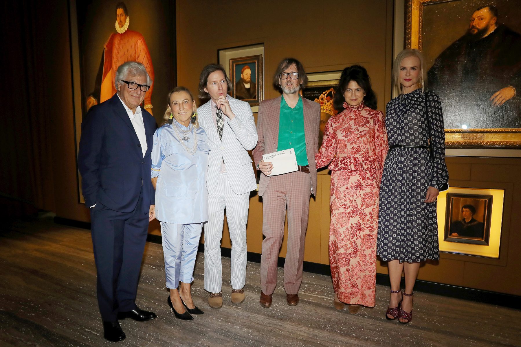 MILAN, ITALY - SEPTEMBER 18: Patrizio Bertelli, Miuccia Prada, Wes Anderson, Jarvis Cocker, Juman Malouf and Nicole Kidman attend the Private Opening of 'Il Sarcofago di Spitzmaus e altri tesori' exhibition at Fondazione Prada on September 18, 2019 in Milan, Italy. (Photo by Vittorio Zunino Celotto/Getty Images for Fondazione Prada)