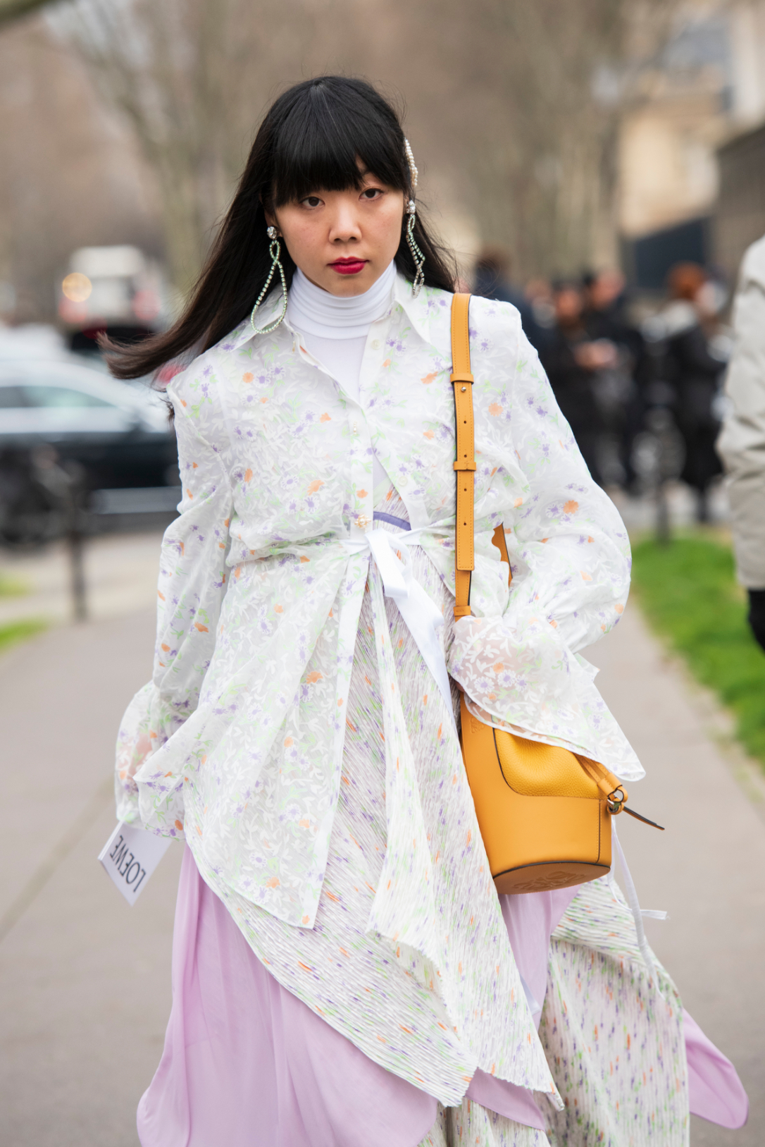 Street Style - Paris Fashion Week - Womenswear Fall/Winter 2020/2021 : Day Five PARIS, FRANCE - FEBRUARY 28: Fashion editor Susie Lau wears all Loewe with Miu Miu earrings on February 28, 2020 in Paris, France.
