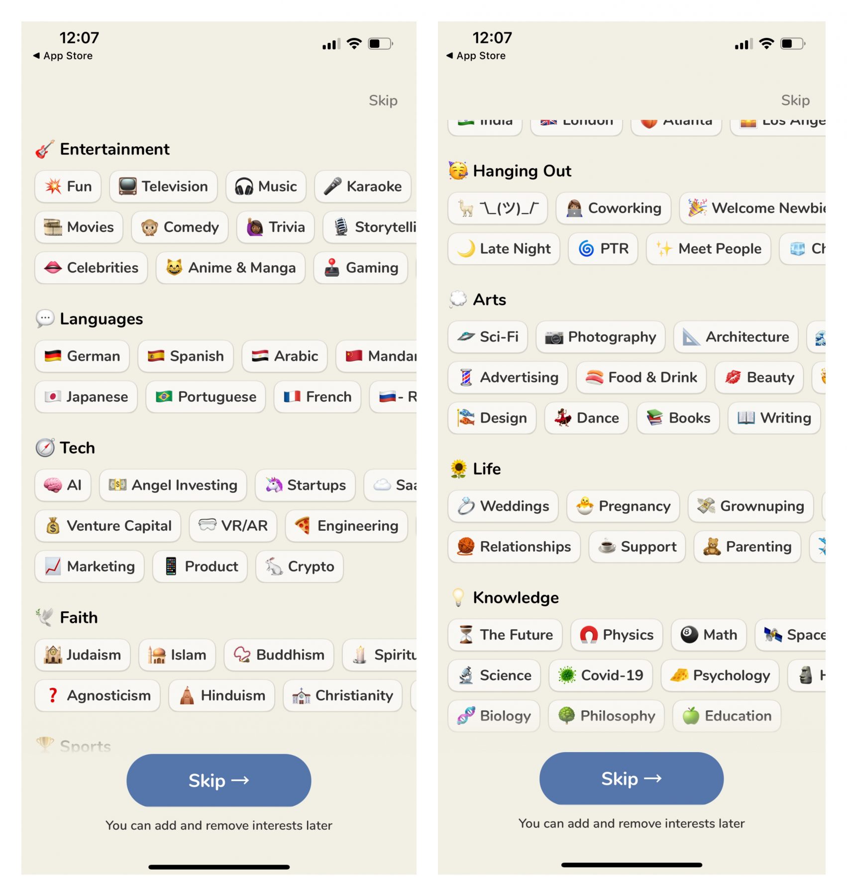 登入app過後,會看到一些追蹤建議,例如身邊朋友、名人的帳號等,還有可以挑選自己感興趣的題目,方便 Clubhouse 推薦大家以後可以加入哪些聊天室。